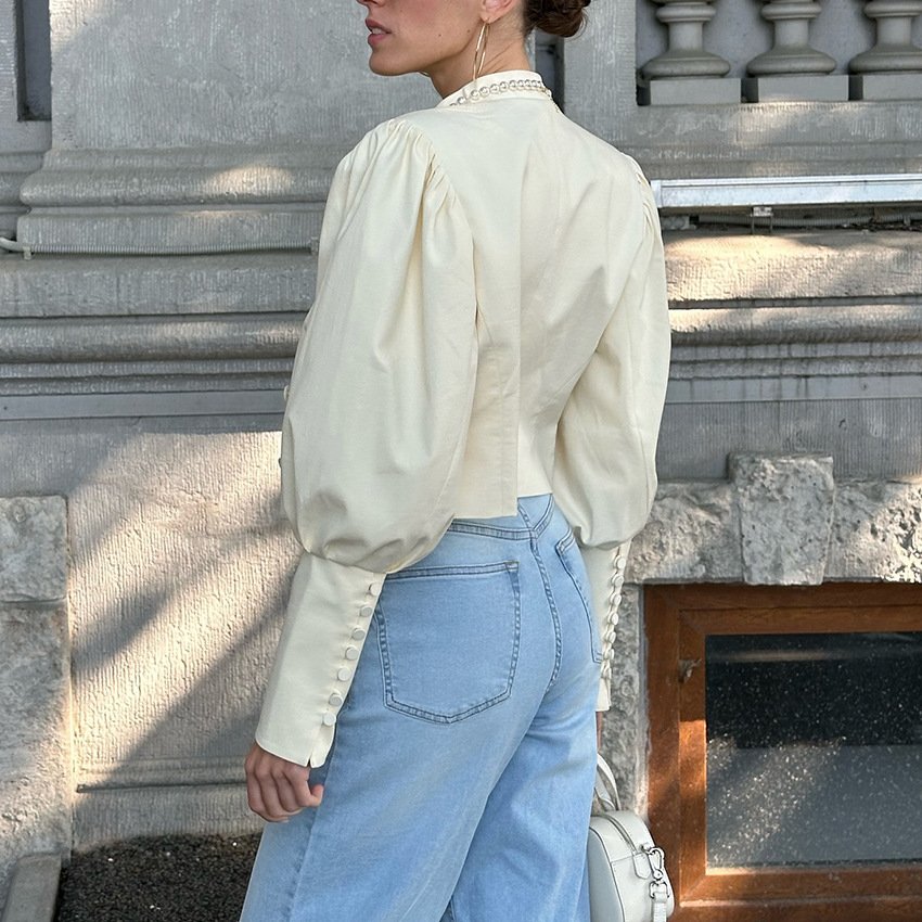 Autumn’s high-end small stand-up collar puff sleeve shirt is designed to be stylish and stylish for commuting
