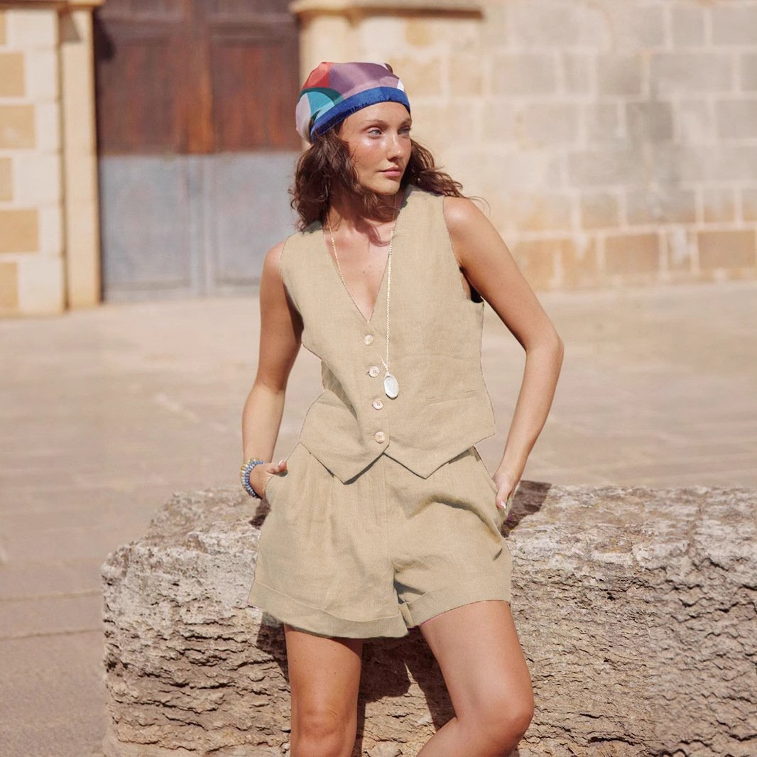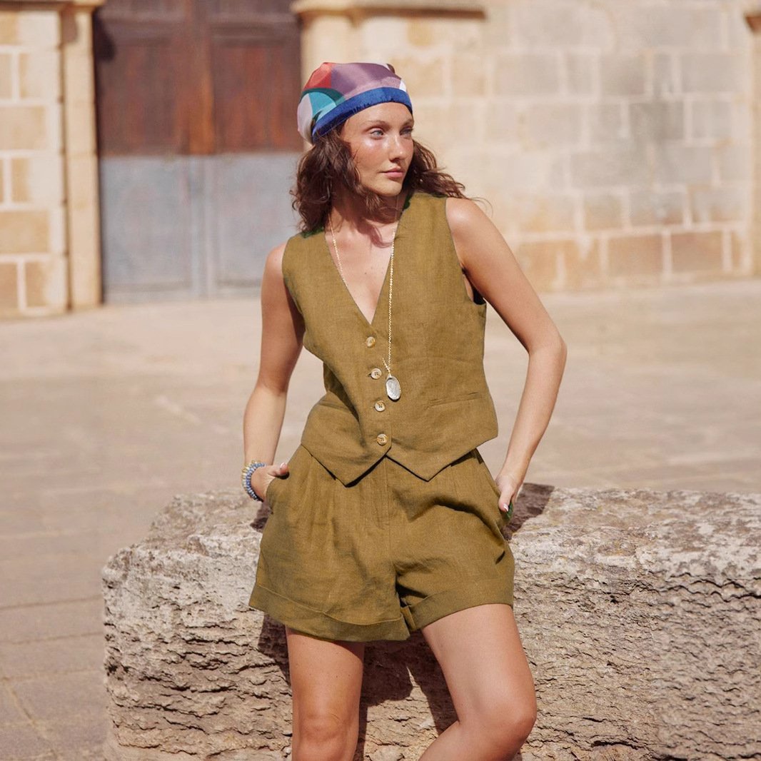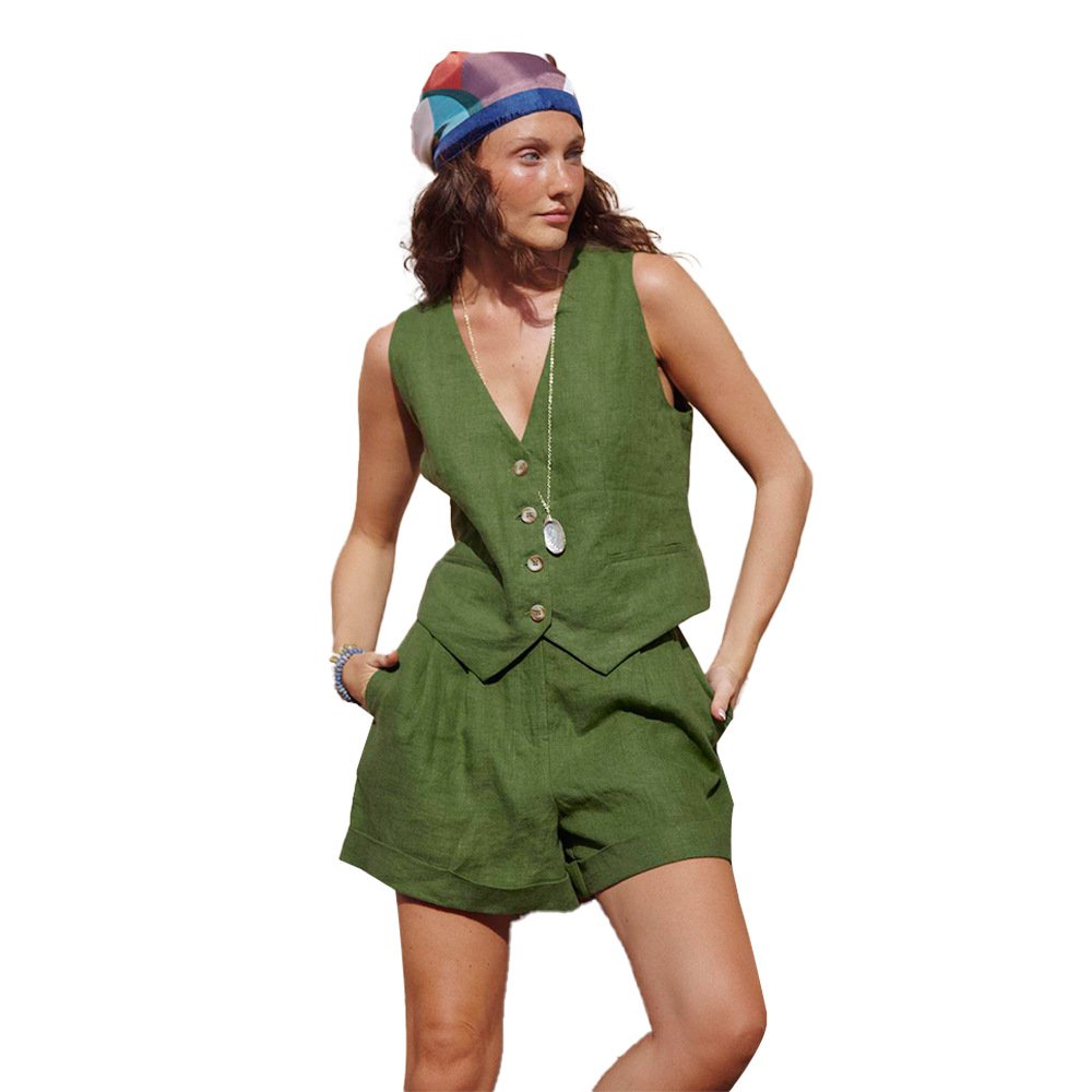 Cotton and linen vest shorts suit spring women's green vest shorts casual suitCotton and linen vest shorts suit spring women’s green vest shorts casual suit