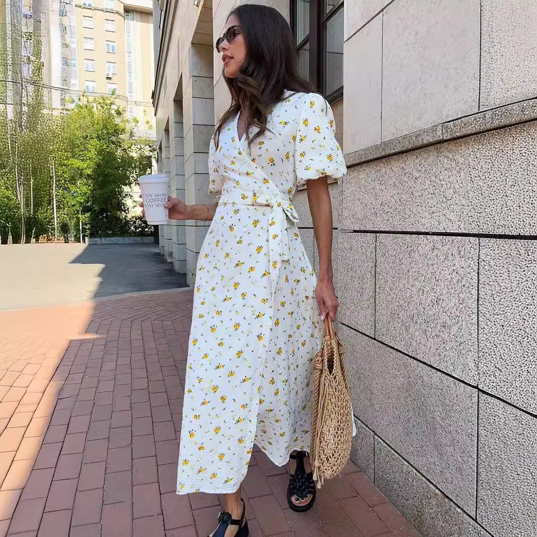 Pure cotton printed dress women’s puff sleeve collar lace up short sleeve printed dress