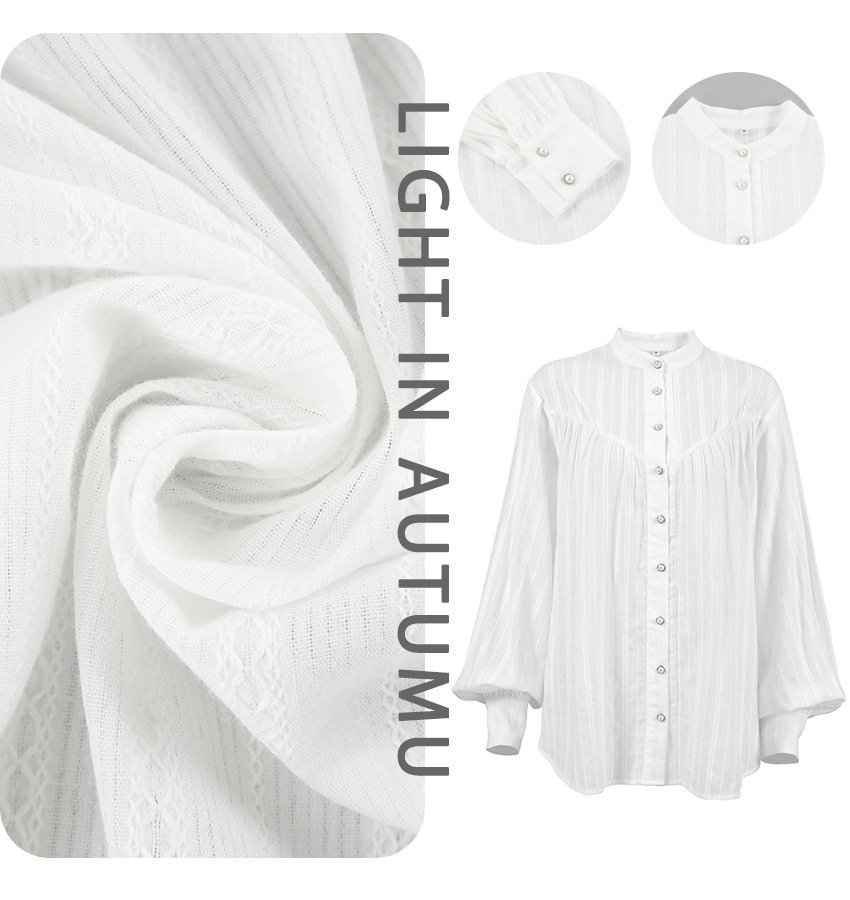 Clothes length: Ordinary (50c Collar type: Stand collar Sleeve type: puff sleeves Popular elements: buttons year season: Winter 2025 color: White, composition: 100% cotton, weight: 9g, hair in seconds size: S,,L style type: Temperament commuting placket: single breasted Main fabric ingredient content: 95% and above style type: Elegant temperament Whether: Yes Get the bid: No collar bid Type: Hang tag: No tag Main downstream sales areas 1: Applicable body type: Universal Main downstream sales areas 2:
